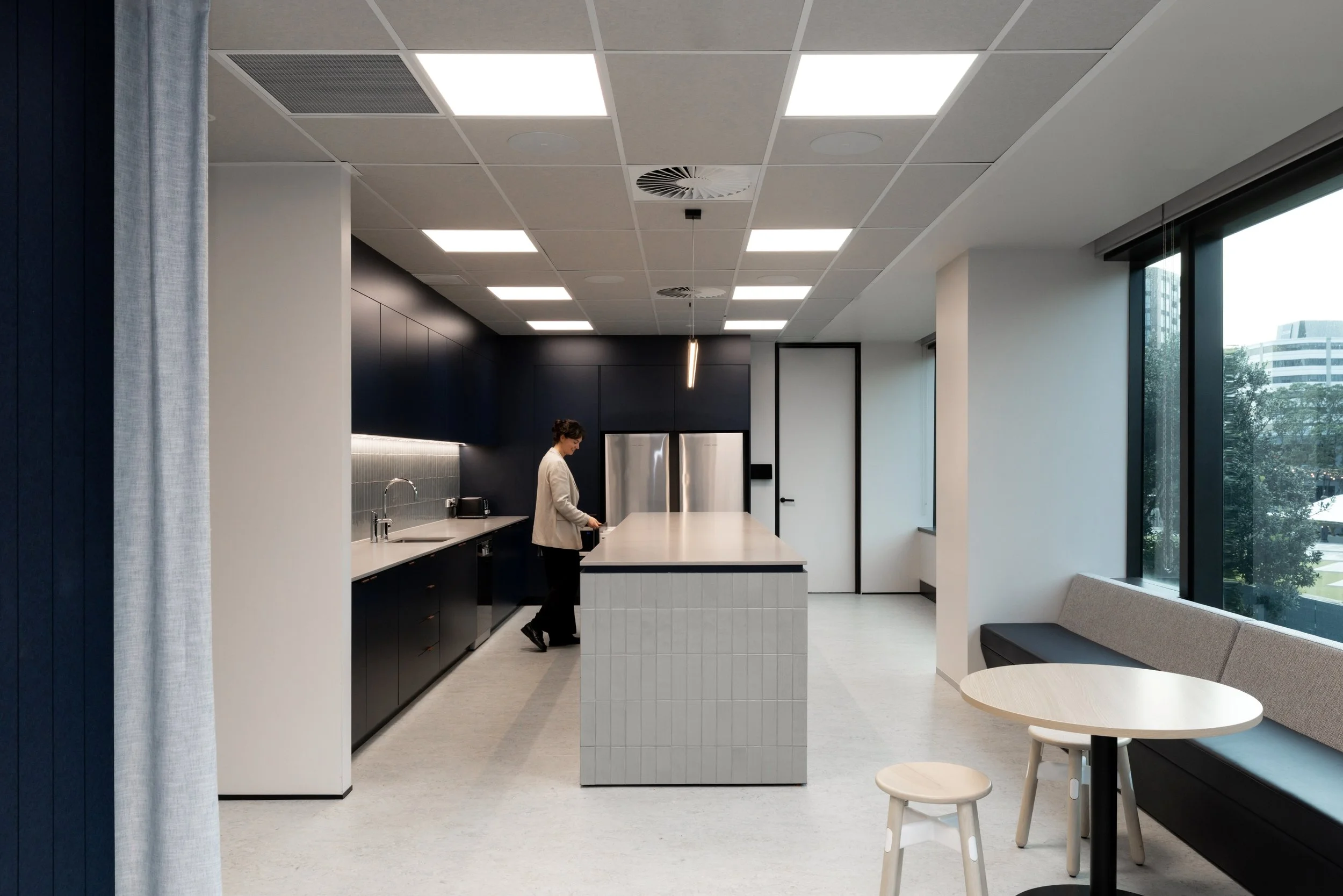 The scope comprised open-plan workspaces, enclosed meeting rooms, a boardroom, and a multifunctional kitchen and collaboration hub, designed to support both focused work and team engagement.